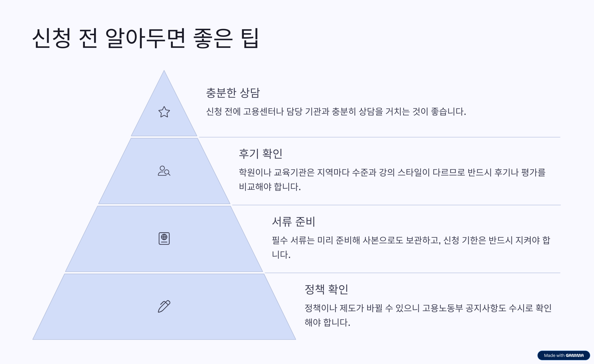 먼저, 신청 전에 고용센터나 담당 기관과 충분히 상담을 거치는 것이 좋습니다. 훈련 계획이 불분명하면 승인되지 않을 수 있기 때문입니다.