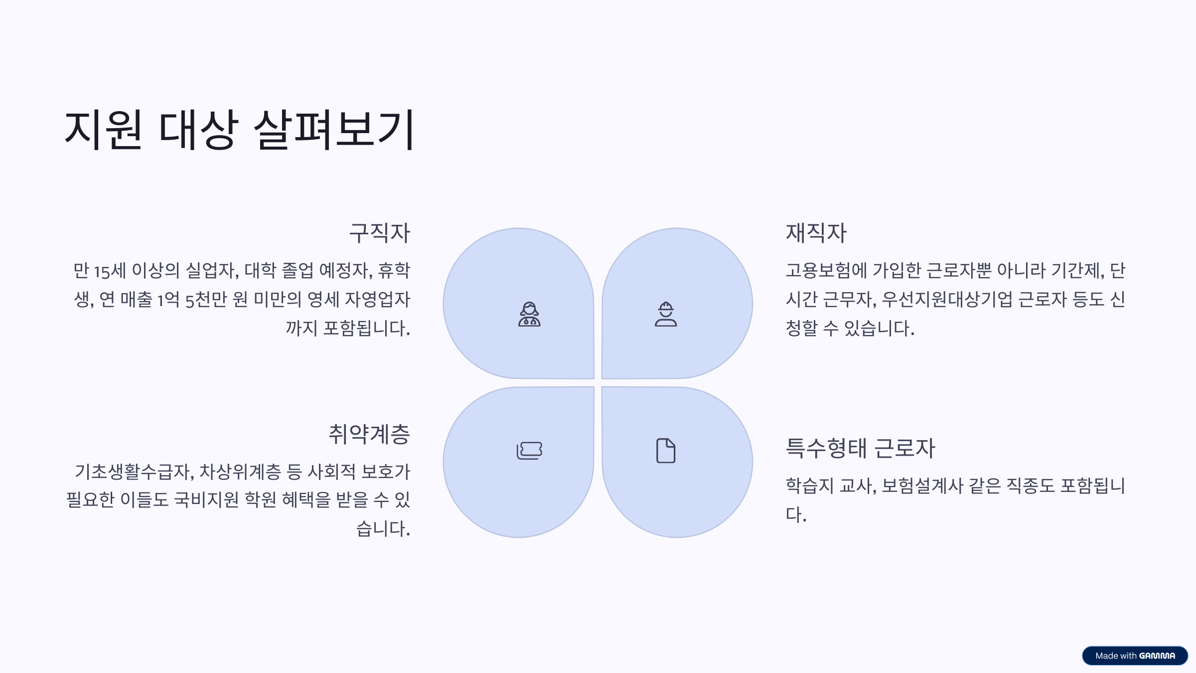 둘째는 재직자입니다. 고용보험에 가입한 근로자뿐 아니라 기간제, 단시간 근무자, 우선지원대상기업 근로자 등도 신청할 수 있습니다.