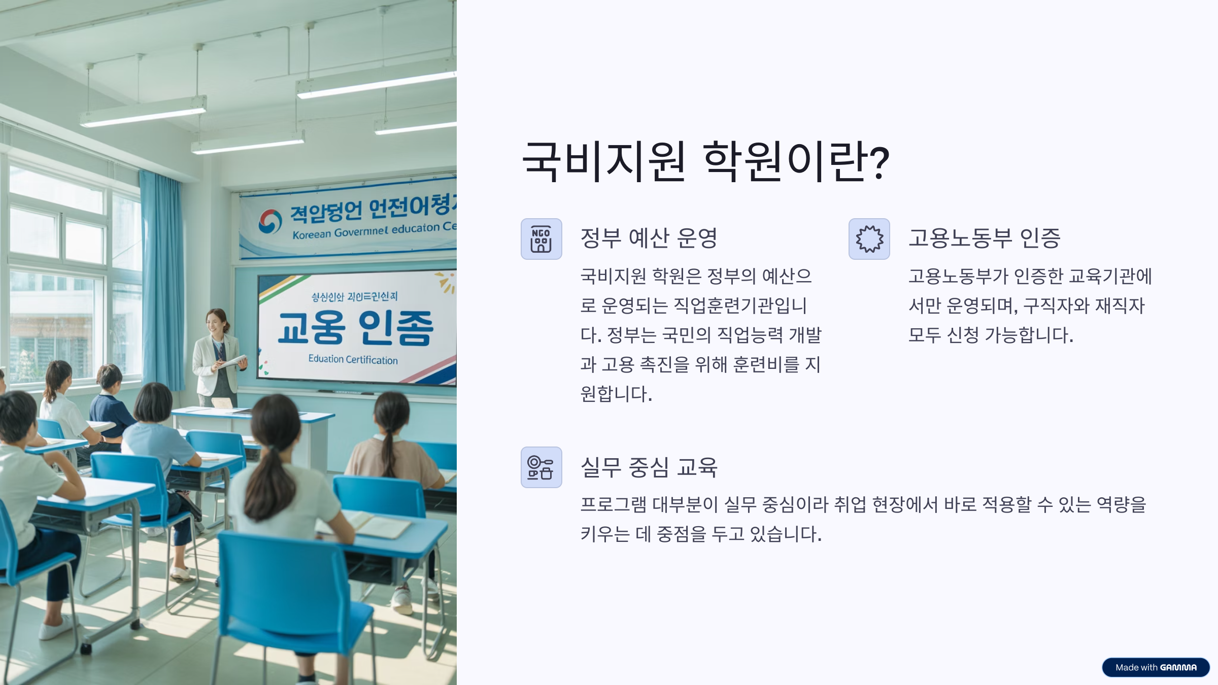 국비지원 학원은 교육비 걱정 없이 실질적인 직무 능력을 높일 수 있는 좋은 기회입니다. 취업을 준비 중이라면, 지금 바로 국민내일배움카드를 신청하고 자신에게 맞는 교육 과정을 찾아보세요. 꾸준한 학습과 전략적 선택이 성공적인 커리어의 출발점이 될 수 있습니다.