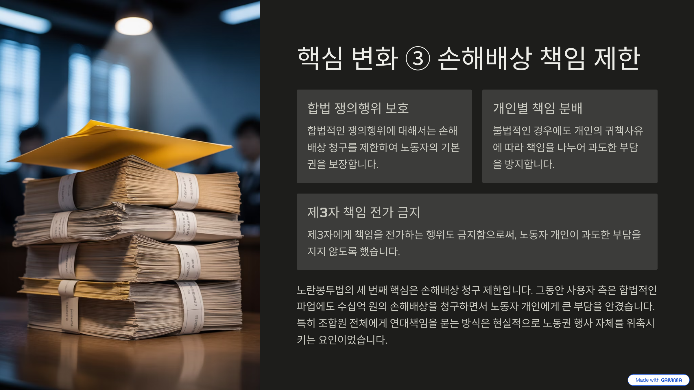 노란봉투법의 세 번째 핵심은 손해배상 청구 제한입니다. 그동안 사용자 측은 합법적인 파업에도 수십억 원의 손해배상을 청구하면서 노동자 개인에게 큰 부담을 안겼습니다. 특히 조합원 전체에게 연대책임을 묻는 방식은 현실적으로 노동권 행사 자체를 위축시키는 요인이었습니다.