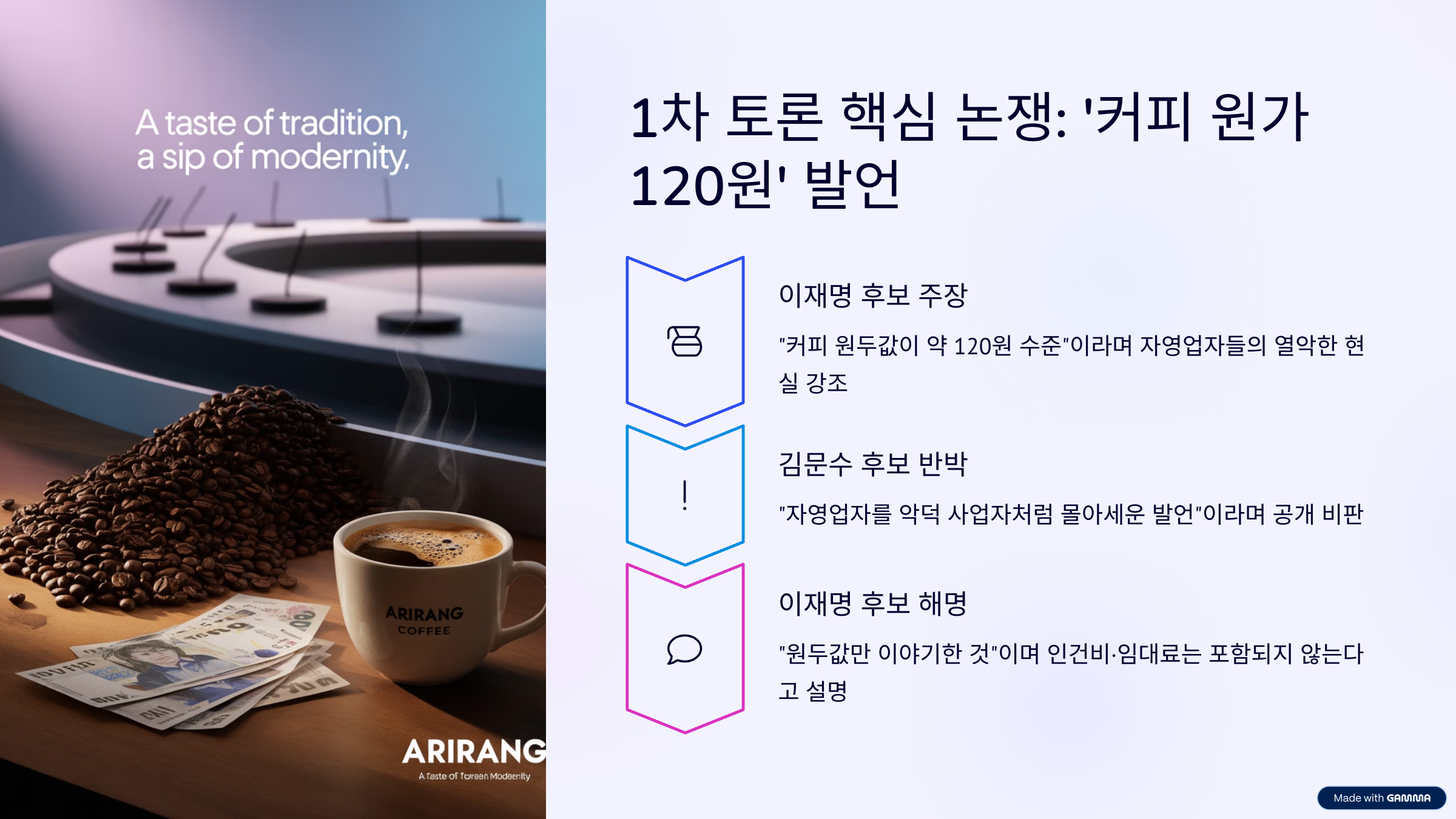 이번 토론에서 가장 주목받은 순간은 바로 이재명 후보의 “커피 원가 120원” 발언이었습니다.