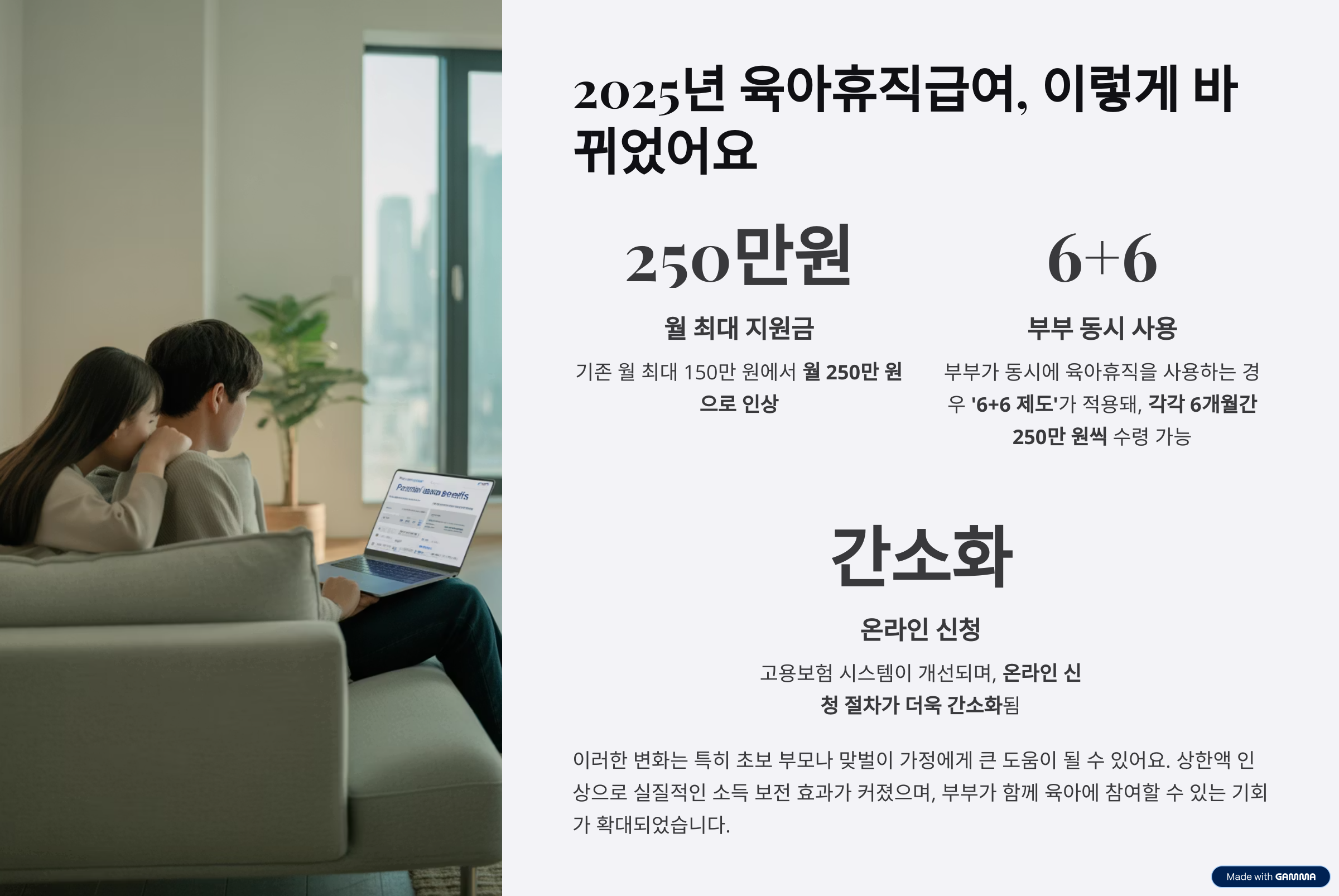 특히 2025년부터 제도가 개편되면서 상한 금액 인상, 동시 육아휴직 지원 확대 등 실질적인 혜택이 늘었어요.